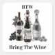 Fügen Sie mit diesem lustigen Aufkleber eine Touch Spaß zu Ihren Habseligkeiten hinzu. Mit drei stilvoll illustrierten Weinflaschen in unterschiedlichen Stilen, begleitet von der spielerischen Phrase "BTW: Bring The Wine". Ideal für Weinliebhaber, um Laptops, Wasserflaschen, Notebooks oder Geschenke für andere Weinliebhaber zu dekorieren.