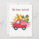 Niedliche Illustrationen eines Hundes, der auf einem LKW sitzt, mit Gepäck und Pflanze, die mit dem Sonnenuntergang dahinter vorbeifahren, sind eine ideale Announcement-Karte, um Ihren Lieben lassen, dass Sie sich bewegt haben.