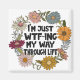 Das Zitat "Ich bin gerade WTF-mein Weg durch das Leben" mit schwarzem Text und einem zornigen Blumenkranz.