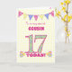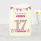 Eine hübsche 17. Geburtstagskarte für Ihren Cousin, mit Polka Punktbündel, Primrose Blume und Zahlen gefüllt mit einem Primromuster, alles auf einem blassgelben Gingham-Hintergrund aus Karo. Die Titelnachricht lautet: "Auf einen ganz besonderen COUSIN heute, 17!" Die Insider-Nachricht ist nur ein Vorschlag und Sie können sie einfach personalisieren oder löschen, wenn Sie es vorziehen.