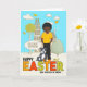 Die kühne und bunt gefärbte EASTER-Typografie gibt einem jungen Jungen mit brauner Haut und seinem Grubenbull Pal einen Platz, um gegen eine frühlingshafte Nachbarschaft-Szene zu stehen, auf diesem lustigen Gruß für Ihren jungen Neffen.