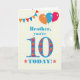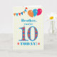 Eine farbenfrohe Geburtstagskarte für einen 10-jährigen Bruder. Die große Zahl 10 gefüllt mit einem orangen, roten und blauen Muster, in hellblau umrissen. Oben sind Ballons und Bollen, in passenden Farben, und der Gruß auf der Titelseite ist: 'Bruder, du bist heute 10!' in hellroten und blauen Buchstaben, auf einem sehr blassgelben und weißen Polka-Punkt-Hintergrund, mit roten und orangefarbenen Sternen auf jeder Seite des Wortes 'HEUTE!'. Die Insider-Nachricht kann auf Wunsch einfach angepasst oder gelöscht werden.
