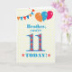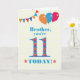 Eine farbenfrohe Geburtstagskarte für einen 11-jährigen Bruder. Die große Zahl 11 gefüllt mit einem orangen, roten und blauen Muster, in hellblau umrissen. Oben sind Ballons und Bollen in passenden Farben, und der Gruß auf der Titelseite ist: 'Bruder, du bist heute 11!' in hellroten und blauen Buchstaben, auf einem sehr blassgelben und weißen Polka-Punkt-Hintergrund, mit roten und orangefarbenen Sternen auf jeder Seite des Wortes 'HEUTE!'. Die Insider-Nachricht kann auf Wunsch einfach angepasst oder gelöscht werden.