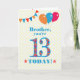 Eine farbenfrohe Geburtstagskarte für einen 13-jährigen Bruder. Die große Zahl 13 ist mit einem orangefarbenen, roten und blauen Muster gefüllt, das in hellblau dargestellt ist. Oben sind Ballons und Bollen, in passenden Farben, und der Gruß auf der Titelseite ist: 'Bruder, du bist heute 13!' in hellroten und blauen Buchstaben, auf einem sehr blassgelben und weißen Polka-Punkt-Hintergrund, mit roten und orangefarbenen Sternen auf jeder Seite des Wortes 'HEUTE!'. Die Insider-Nachricht kann auf Wunsch einfach angepasst oder gelöscht werden.