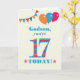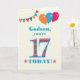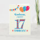 Eine farbenfrohe Geburtstagskarte für einen 17-jährigen Paten. Die große Zahl 17 ist mit einem orangefarbenen, roten und blauen Muster gefüllt, das in hellblau dargestellt ist. Oben sind Ballons und Bollen, in passenden Farben, und der Gruß auf der Titelseite ist: 'Godson, du bist heute 17!' in hellroten und blauen Buchstaben, auf einem sehr blassgelben und weißen Polka-Punkt-Hintergrund, mit roten und orangefarbenen Sternen auf jeder Seite des Wortes 'HEUTE!'. Die Insider-Nachricht kann auf Wunsch einfach angepasst oder gelöscht werden.