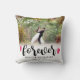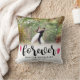 Throwkissen im Weiß mit für immer geschrieben in ein schönes Skript, bookended durch rosa Herzen, über Ihrem Hochzeits-Foto. Addieren Sie Ihre Namen und Hochzeitsdatum auch. Die Rückseite striped in zusammenpassenden Farben.