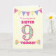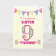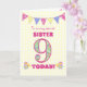 Eine hübsche 9. Geburtstagskarte für Ihre Schwester, mit Polka Punktbündel, Primrosen-Blume und Zahlen gefüllt mit einem Primromuster, alles auf einem blassgelben Karo Gingham Hintergrund. Die Titelnachricht lautet: "Zu einem ganz besonderen SISTER 9 HEUTE!" Die Insider-Nachricht ist nur ein Vorschlag und Sie können sie einfach personalisieren oder löschen, wenn Sie es vorziehen.