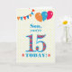 Eine farbenfrohe Geburtstagskarte für einen 15-jährigen Sohn. Die große Zahl 15 ist mit einem orangefarbenen, roten und blauen Muster gefüllt, das in hellblau dargestellt ist. Oben sind Ballons und Bollen, in passenden Farben, und der Gruß auf der Titelseite ist: "Son, du bist heute 15!" in hellroten und blauen Buchstaben, auf einem sehr blassgelben und weißen Polka-Punkt-Hintergrund, mit roten und orangefarbenen Sternen auf jeder Seite des Wortes "HEUTE!". Die Insider-Nachricht kann auf Wunsch einfach angepasst oder gelöscht werden.