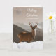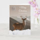 Frohe Weihnachten, Papier Grußkarte für einen Stiefel. Weihnachts-Winterurlaub-Karte hat ein männliches Reh auf dem Cover mit einem Gebirge und Mond hinter sich. Im Vordergrund steht tiefer Schnee. Passen Sie das Cover und die Nachricht im Inneren an, wie Sie möchten. Illustration digitaler Kunstmalerei. Art, Bild und Vers Copyright © Shoaff Ballanger Studios, 2023.
