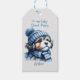 Ein wunderschönes Bild eines niedlichen kleinen Welpen, der für den Winter verkleidet ist, macht dieses Jahr einen niedlichen Geschenktag für diesen großen Welpen. Blau auf weißem Texturhintergrund mit entsprechendem Text auf der Rückseite und vorne.