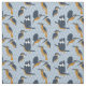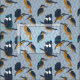 Dieser gemusterte Stoff eignet sich hervorragend zum Nähen von Geschenken für Vogelliebhaber. Hier finden Sie Abbildungen von Königsfischen in blau, Senfgold und weißem Set vor einem gemusterten hellblauen Hintergrund.