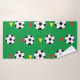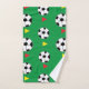 Fußball Ball Handtuch Set von Nisha Prabhu entworfen. Dieses Set zum Thema Fußball ist genau das, was Sie brauchen, um Ihre Liebe für Fußball auszudrücken. Das Design umfasst große Fußballbälle mit roten und gelben Fahnen auf grünem Hintergrund. Sportgeschenke für Fußball-Coach, Fußballmannschaft, Fußballfans, Fußball-Spieler, Fußball-Liebhaber.