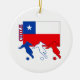 Spiel mit drei Fußballspielern vor der chilenischen Flagge. Ländername Chile ist auf der Seite