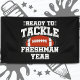 Dieses lustige Frischmannjahrdesign ist perfekt für einen High School-Frische-Football-Spieler oder 9. Klasse Lehrer, die Lieben, ihre High School Fußball-Mannschaft zu unterstützen! Perfekt für den Rückweg in die Schule, den 8. Abschluss oder das ganze Schuljahr! Features 'Ready to Tackle Freshman Year' High School Frischman Zitat mit Fußball Grafik. Ideal für einen Lehrer der 9. oder 9. Klasse, der Lieben hat, Fußball zu sehen oder zu spielen!