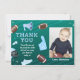 Football First Birthday Dankeschön Card mit Foto ist Teil der Football Ball First Birthday Party Kollektion. Dieses Produkt bietet grüne und blaue Farben, Kugeln, Hüte, Accessoires. Fertig meistens in Grün & Blau mit dekorativen Schriftart. Entdecken Sie mehr passende Produkte in unserem Shop.