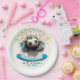 Teller zum Fußball-Party mit einem Fußball, der in einer Geburtstagstorte landet. Text bearbeiten, um Namen hinzuzufügen.