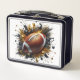 Diese Lunchbox wird mit einem farbigen Spritzkunst-Fußball-Kunststoffdruck gezeigt.
