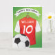 Personalisierte Kinderfußball-Geburtstagskarten mit einem hellgrünen verblassten Hintergrund und einem rot-weißen Fußball/Fußball-Shirt, das Sie mit dem Namen und dem Alter der Kinder personalisieren können, und einem Ball ganz unten. Diese Fußball-Geburtstagskarte wird das Geburtstagskind beeindrucken, sei es Ihr Sohn/Ihre Tochter, Neffe/Nichte, Enkel/Enkel/Enkel oder Freund, buchstäblich jeder, der verrückt Sport treibt! Vergessen Sie nicht, Ihre spezielle Nachricht in die Karte einzufügen!