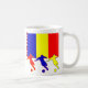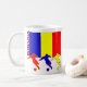 Drei rumänische Fußballspieler in der Silhouette spielen vor der Rumänien-Flagge. Ländername Rumänien ist entlang der Seite.