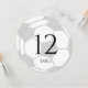 Fußball feiert Tischnummer. Runde Fußball-Tischnummer in Silber, und bearbeitbarer Text auf beiden Kartenvorderseiten.