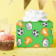 Fußball-Thema Umhüllungspapier mit Shirts in orangefarbenem Gold. Das Muster ist ein Design im Stil eines Cartoon. Es zeigt die lächelnden Gesichter der glücklichen Fans und eine Reihe von Fußbällen.