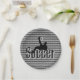 Auf dem Wort Fußball fotografiert, tritt ein Fußballspieler den Fußball