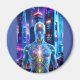 Eine leuchtende menschliche Form steht vor dem Hintergrund futuristischer Wolkenkratzer, die durch lebendige Farben und Energiepunkte verschiedene Körperteile beleuchten. Das Hightech-Stadtbild reflektiert Neonlichter und schafft eine dynamische und dynamische Atmosphäre. Digitale Kunstfotografie CS5