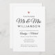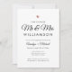 Diese minimale Einladung glänzt durch ihre Einfachheit. Eine schöne Schrift mit Schnörkeln lautet "The Future Mr. and Mrs." neben Ihren persönlichen Feierlichkeiten Details in der modernen Typografie. Oben sitzt ein zartes Imitat Rose goldenes Herz.