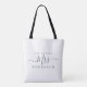 Zukünftige Frau moderne Schwarz-Weiß-individuelle Name Tasche mit dem Text Frau in schwarz elegante Drehkalligraphie. Fügen Sie einfach den verheirateten Namen der Braut hinzu und das perfekte Brautparty Geschenk ist für Sie bereit zu geben. Exklusiv für Sie entworfen von Happy Dolphin Studio.