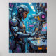 Dieses Bild zeigt ein weibliches Cyborg, das eine komplexe Workstation in futuristischer Umgebung betreibt. Ihr Körper und ihr Helm sind eine Mischung aus metallischem Grau und Weiß, mit leuchtenden orangefarbenen Lichtern. Der Hintergrund ist ein dichtes, kompliziertes Netz von Maschinen und Monitoren, die alle mit einem dicken, strukturierten impasto Stil gerendert werden. Die Farbpalette der Blues und Orangen des Kunstwerks schafft eine dynamische und technologisch fortschrittliche Atmosphäre.
