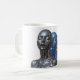 Three metallic female android heads in silver, blue, and green with closed eyes, printed on a sleek white mug.