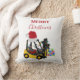 Eine niedliche Illustration eines gelben Gabelstaplers mit einer Weihnachtsmannmütze und in Weihnachtsbeleuchtung mit den Worten "Frohe Weihnachten" dekoriert. Der festliche Gabelstapler trägt Weihnachtsgeschenke und Geschenke. Ideal für Transportfahrer jeden Alters. Ein ideales Weihnachtskonzept für Gabelstaplerfans, ob groß oder klein, Mädchen oder Jungen.