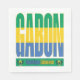 Die Nationalflagge Gabuns ist in den Namen des Landes eingeflossen. Unter diesem Bild befindet sich der Name des Landes, wie er national bekannt ist, und auf beiden Seiten des Namens befinden sich zwei nationale Wappen.