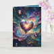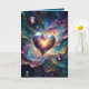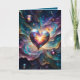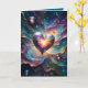 A luminous heart-shaped object glows at the center, surrounded by vibrant cosmic swirls. Small spherical orbs add depth to the celestial scene.