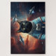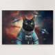 Ein faszinierendes Bild einer schwarzen Katze, die als Astronaut gekleidet ist und selbstbewusst in den Kosmos blickt. Umgeben von fliegenden Untertassen und einem lebendigen Nebel verkörpert die Katze ein Gefühl von Abenteuer und Mysterium.