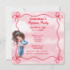 A cute red ribbon frame surrounds the details in red text, with an element of a woman dressed in blue pj's.