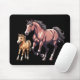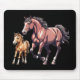 Eine dynamische Darstellung von zwei Pferden, eines größer und muskulös mit fließender Mähne, und das andere, ein kleinerer Foal, beide in einer energischen Haltung dargestellt. Sie sind Set vor einem schlichten, weißen Hintergrund und betonen ihre starke Form und Bewegung.
