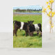 Glücklich in einem großen, üppigen Feld, geniessen zwei junge, gepolsterte Galloway Calves einen sonnigen Nachmittag mit einem schönen Geburtstagslogo.