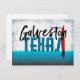 Galveston Texas Surfdesign. Ein rotes Surfbrett mit blauem und türkisfarbenem Text - Typografie Surfer Thema.