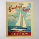 Diese Gruß aus Galveston Texas Vintage Reise nautische Design verfügt über ein Boot auf dem Wasser mit Möwen und einen blauen Himmel gefüllt mit prächtigen puffigen weißen Wolken.
