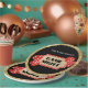 Diese Party-Teller bieten ein glamouröses Spielabendthema auf schwarzem Hintergrund. In der Mitte befindet sich ein Markierungsschild mit einem goldenen Glitzer und einem roten Rahmen mit Lichtern. Roter Glitzer, der Würfel spielt, wird auf beiden Seiten des Zeichens platziert. Eine goldene Sequenz umrahmt die Platte.