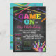 Unser originelles, bestverkauftes Girl's Game On Arcade Bowling Pizza Party Chalkboard Stil Geburtstagsfeier lädt zu jeder Spielthementparty mit Arcade, Laser Tag, Bowling oder Pizza ein. Unser Design verfügt über einen Chalkboard-Hintergrund, eine Mischung aus bunten Buchstaben, Arcade-Spiel, Pizza, Bowlingball und Buttone und Lasergrafik.