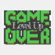 Game Over is depicted in bold, pixelated lettering, with the words “Level Up” creatively superimposed on it in an ornate script at its center and a sun shining behind it at the top. The design combines playful and bold elements reminiscent of classic video game graphics..