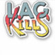Cooles Gaming-Witz-Design mit "Lag tötet" Zitat. Die Buchstaben sind mit schwarzem Schatten gemacht, die Verzögerung ist blau, die Tilles sind gelb mit roten Splash.