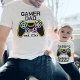 Individuell gestaltbarer "Gamer Papa" mit dem festgelegten Datum für die Zuordnung von Outfits für einen Vater und ein Kind mit einem Imitat neon Retro-Gaming-Controller.