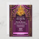 Ein schöner Tempelbogen in lila Farbtönen ist mit verzierten goldenen Wirbel und Schnörkeln geschmückt. Ein kühner goldener Ganesha, der Gott der Weisheit, Anfänge und die Entfernung von Hindernissen Erholungen auf der Spitze des Bogens schauend Regal. Dieses Hindi inspirierte Design hat weiße Vorlagen für Ihre benutzerdefinierte Formulierung und die Rückseite hat eine zusätzliche Vorlage für weitere Details für Gäste und Familie, die entfernt werden können, wenn nicht erforderlich. Die warmen, reichen Farben verleihen diesem Design ein luxuriöses, elegantes und gehobenes Ambiente. Diese Einladung ist ideal, um jede Hindu-Zeremonie oder jede ethnische asiatische Feier oder Hochzeit zu feiern.