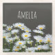 Moderner, stilvoller personalisierter Untersetzer mit sonnigen Gänseblümchen auf dunkelgrauem Hintergrund.