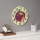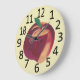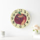 Die fruchtige Wanduhr zeigt ein Bild eines ganzen reifen Pfirsichs mit grünem Blatt. Der Pfirsich ist in rot-gelben Farbtönen gestrichen. Die Uhr hat auch große schwarze Zahlen. Kaufen Sie online bei CherylsArt auf Zazzle.