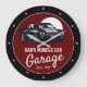 Alle Namen Muskel Auto Garage mit schwarzem Auto auf einem dunkelroten Hintergrund mit einem schwarzen Rand. Verwenden Sie einfach die Option Vorlage personalisieren, um den Text zu ändern. Wählen Sie einfach die Farbe der Hand und die Größe der Uhr.