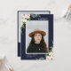 Elegante Rosa- und Weißgartenarrangements, Blumenarrangements und Grünanlagen, Ankündigung des Abschlusses und Einladung. Kartenfunktionen, marineblau Hintergrundfarbe, Single vorne gerahmtes Foto mit 3 zusätzlichen Foto-Leerzeichen auf der Rückseite.